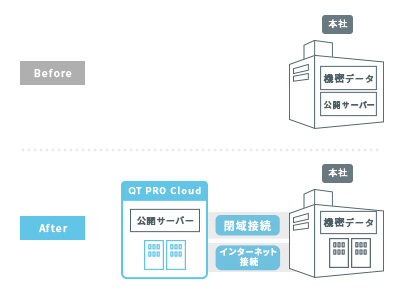 - 公開サーバーはQT PRO Cloudへ、機密データはオンプレミス環境へといった適材適所のシステム配置を、 通信品質を担保しながら実現