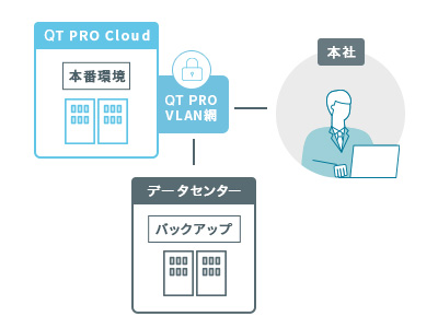 QT PRO Cloudは当社の堅牢なデータセンター内に構築しており、万が一の災害時にも高い耐障害性を発揮します。またお客さま拠点との接続は、インターネット接続に加え、閉域接続にも対応しているため、セキュアで拡張性のある高品質のクラウドサービスをご利用いただけます。